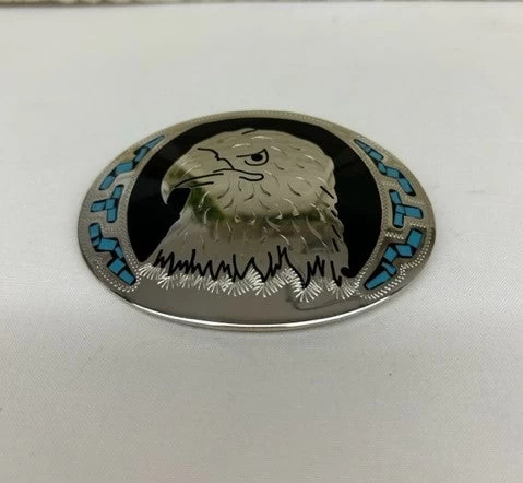 An oval buckle with a large hand cut Silver Eagle head.