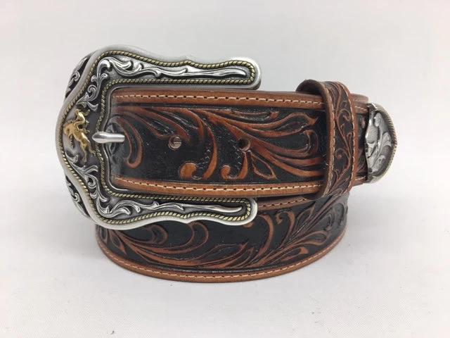 Tan tooled leather with 2 piece antique silver tone buckle set