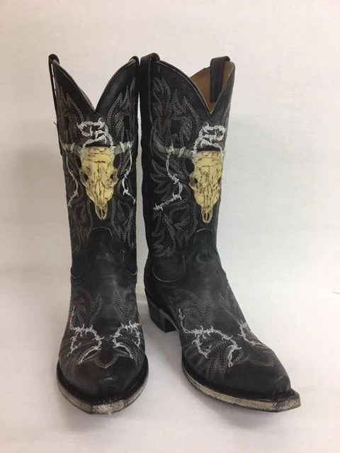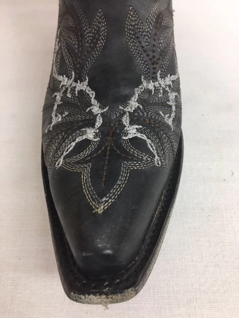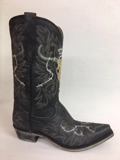 Black soft distressed leather with long horn overlay and barb wire embroidery.
