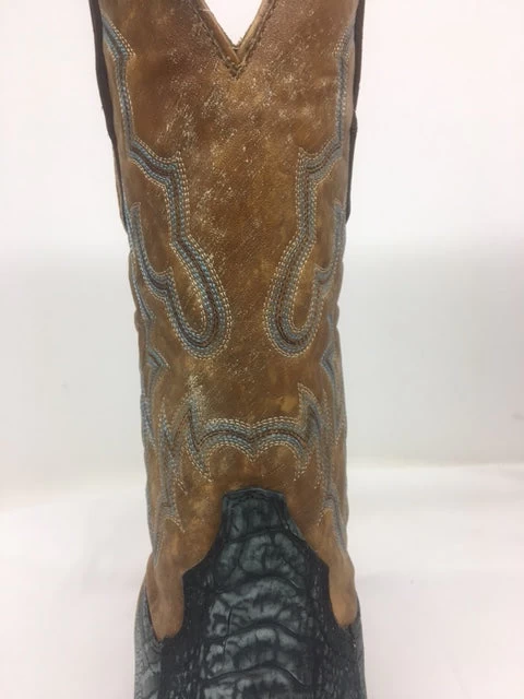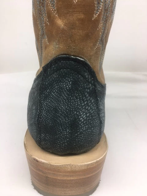 Denim Blue Ostrich Leg Narrow Square Toe with a tan calf skin upper.