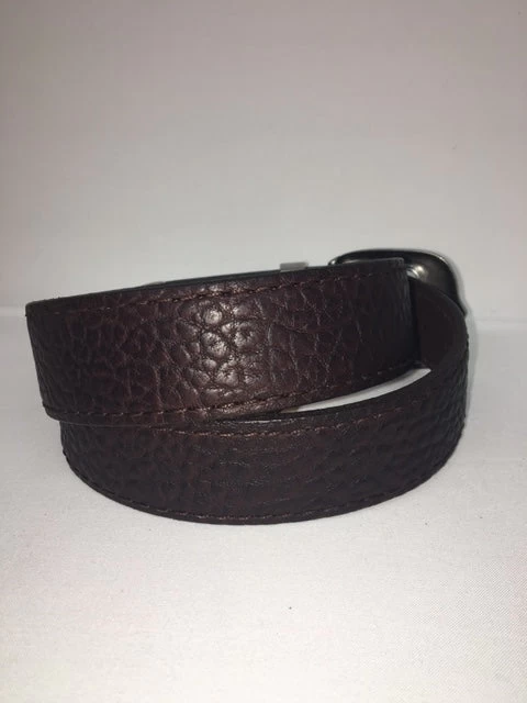 Genuine bison leather featuring a deep bubble print, hand painted flat edges, tonal accent stitching, lined with full grain leather, silver plated antiqued finish buckle, loop, and tip set. (Sewn In)