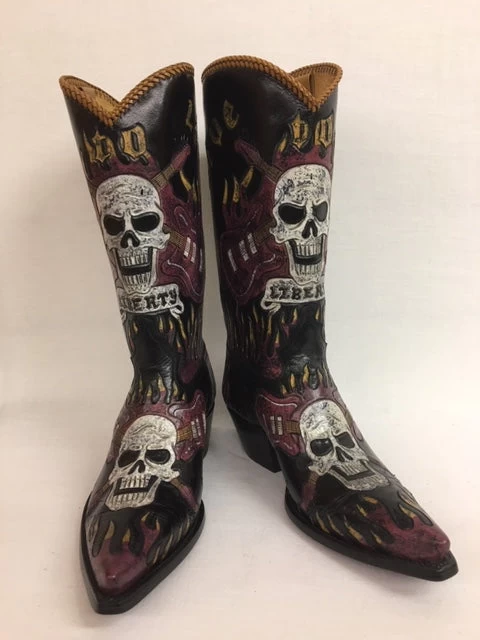 The Rock to Live boot features incredible hand tooled, hand painted skulls, guitars and flames!
