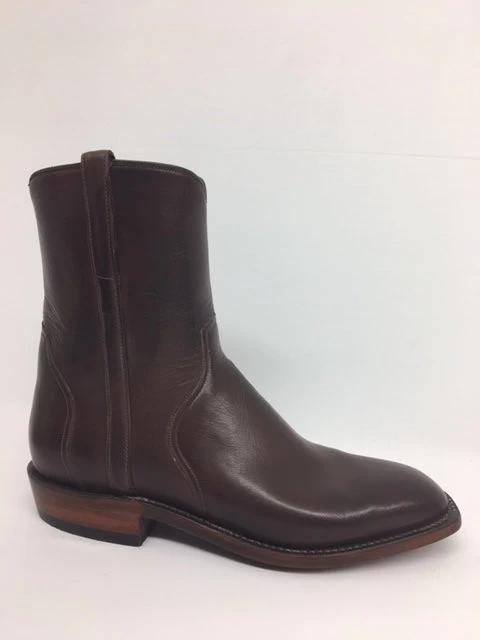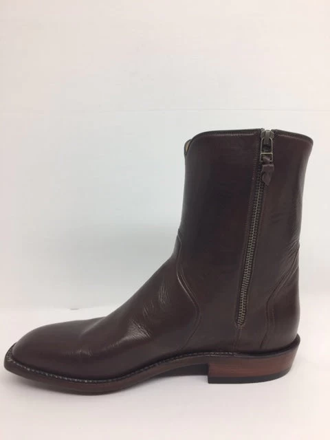 This Whiskey Buffalo Calf is a shorter roper style boot with an inside zipper .
