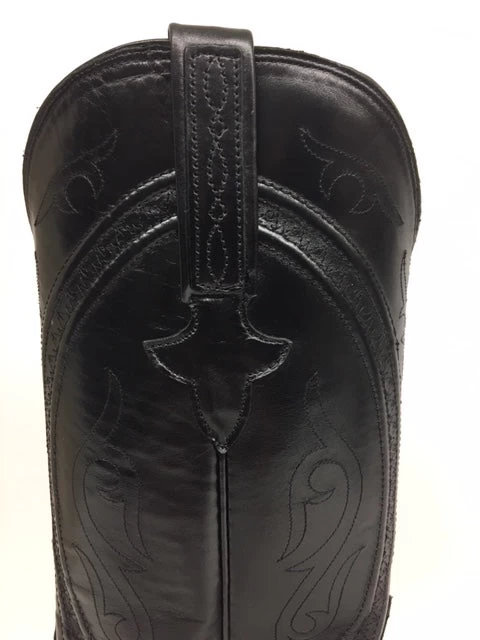This Black Calf is a classic cowboy boot that features cording on the shaft and a stitched toe bug on the vamp. Its smooth Calf skin leather has a polished finish. This a great choice for dress or casual wear. Leather sole.