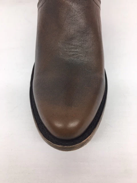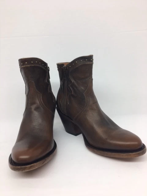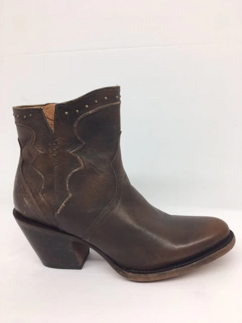 The Karla is a rugged moto-inspired bootie in a maple stone washed finish.