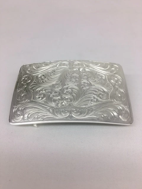 This classic, western belt buckle features an antiqued silver-finished filigree backdrop with a smooth trim.