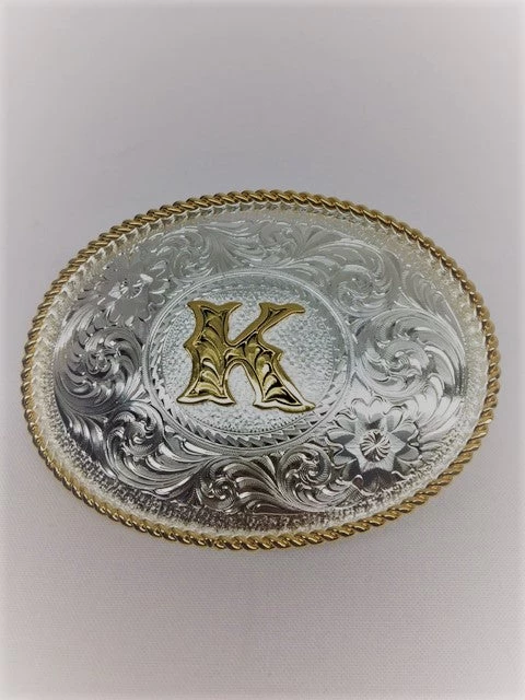 Medium sized silver oval shape belt buckle fully engraved in traditional Western bright cut scrolls. Gold twisted rope trim. Engraved gold letter K in western style font applied to center stippling.