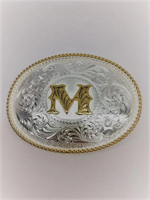 Medium sized silver oval shape belt buckle fully engraved in traditional Western bright cut scrolls. Gold twisted rope trim. Engraved gold letter M in western style font applied to center stippling.