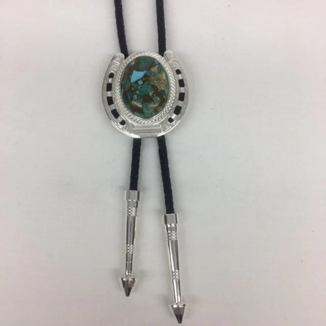 A bright silver-finished bolo is shaped into a horseshoe with black paint to contrast the bright silver functions as the backdrop for the large center stone. Serving as the centerpiece is a compressed stone with hues of blue-greens and browns creating a strong and bold look.