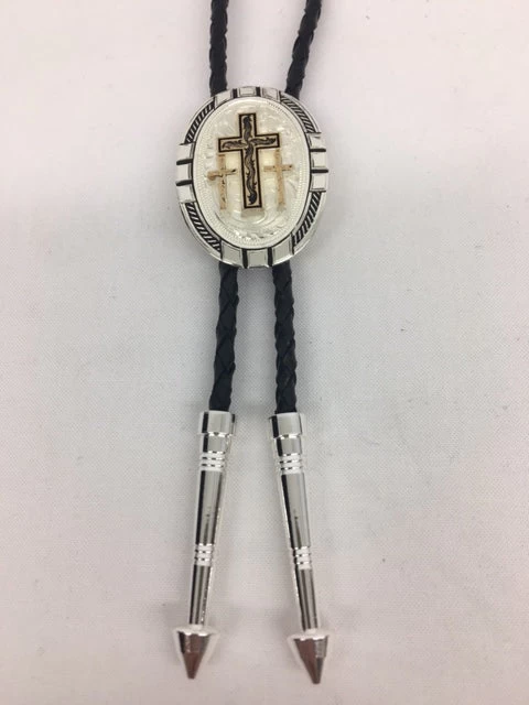 This vertical oval bolo tie features silver engraved in traditional western bright cut floral vines like a small garden, framed with an antiqued twisted rope interspersed with a trio of flourishes in a bright silver finish at the four established compass points. Added to the center of this bolo tie is the gold finished triple cross figure. The black braided leather cord is nicely weighted with two silver arrow pointed tips