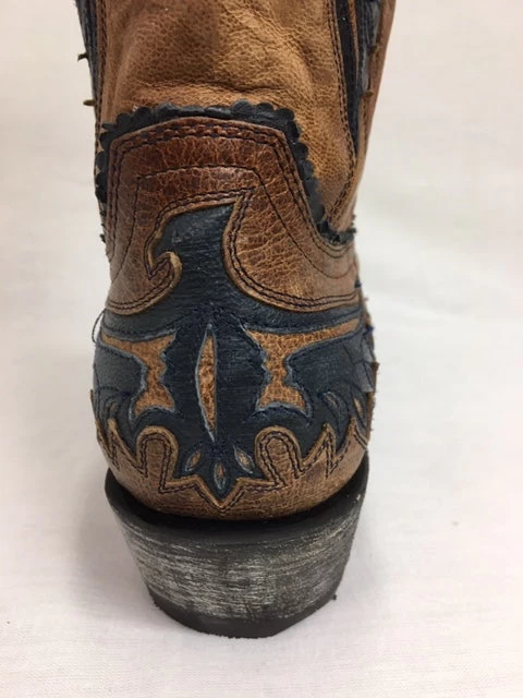 The inlay and overlay of well-textured tan and blue leathers play out very well especially when worn with blue jeans.