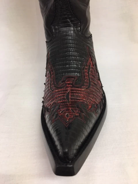 Shaft collar and pull tabs are also lined with the deep red lizard skin, making it a timeless piece to own.