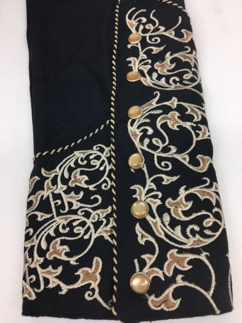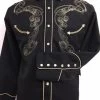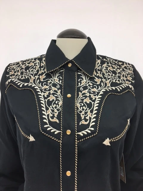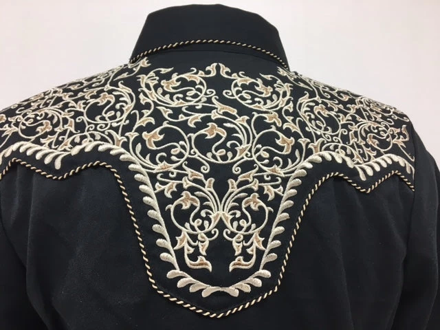 It features a two-tone scroll embroidery on yokes and cuffs.